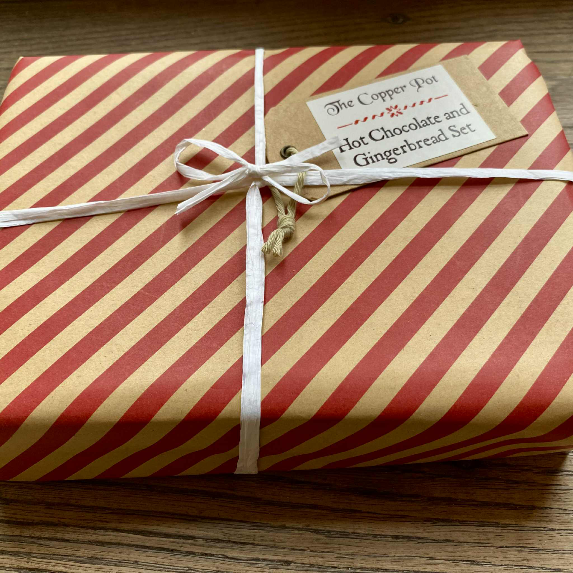 A gift-wrapped set containing a 115g bag of our 1741 Hot Chocolate and a 180g bag of our 18th Century Gingerbread Mix, along with two cookie cutters and a small wooden spoon.